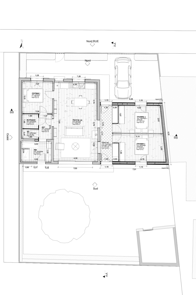 Rue Calixte Camelle, Le Bouscat. Rénovation globale d’une maison et création d’une extension légère de 40 m2 en ossature bois. DP accordée, études en cours, démarrage chantier mai 2026