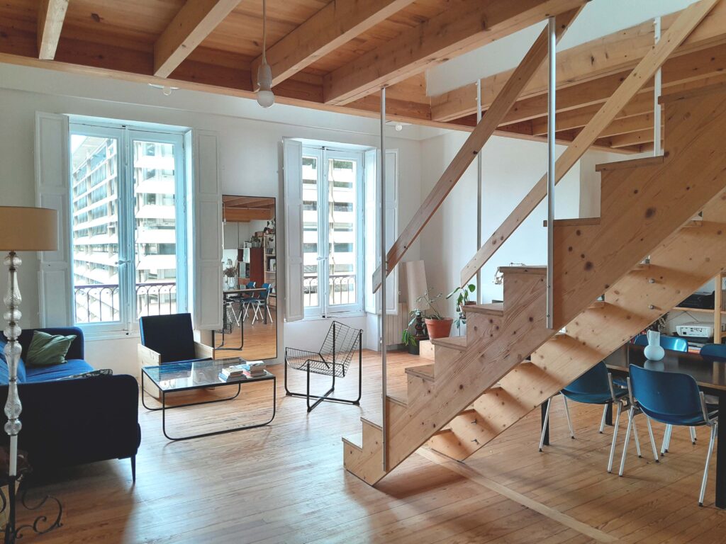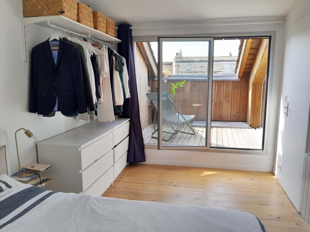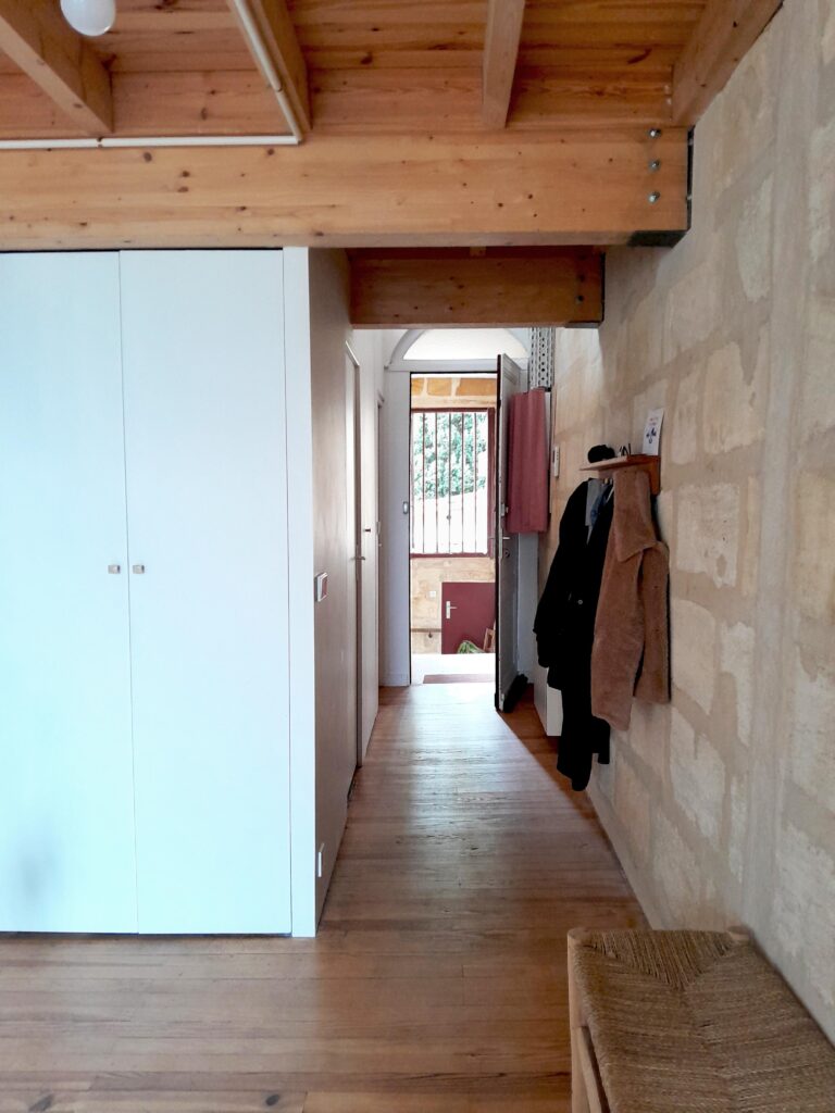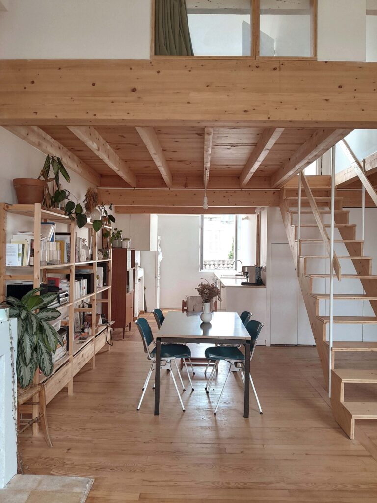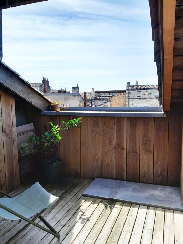 Bordeaux, rue Barreyre. Rénovation complète d’un appartement au sein d’une copropriété dans l’hypercentre bordelais : création d’un plancher en bois, d’une terrasse extérieure (tropézienne), modification des ouvertures, isolation des murs et plafonds. Projet livré en 2023