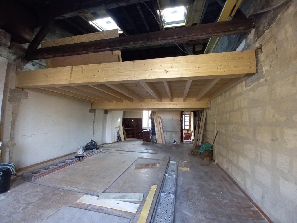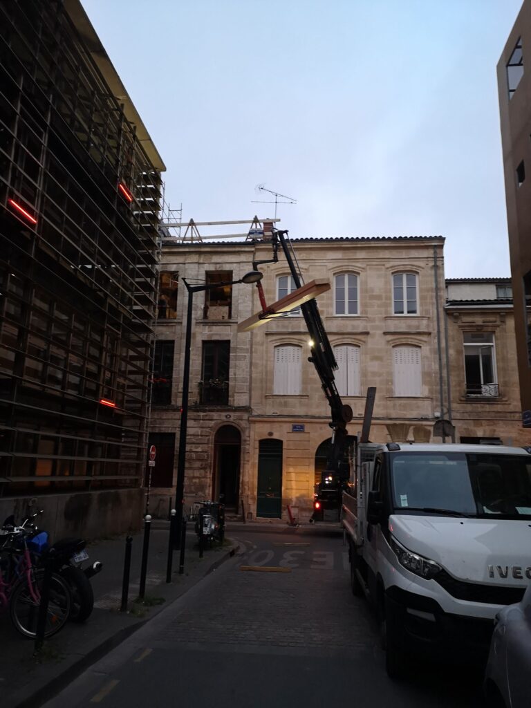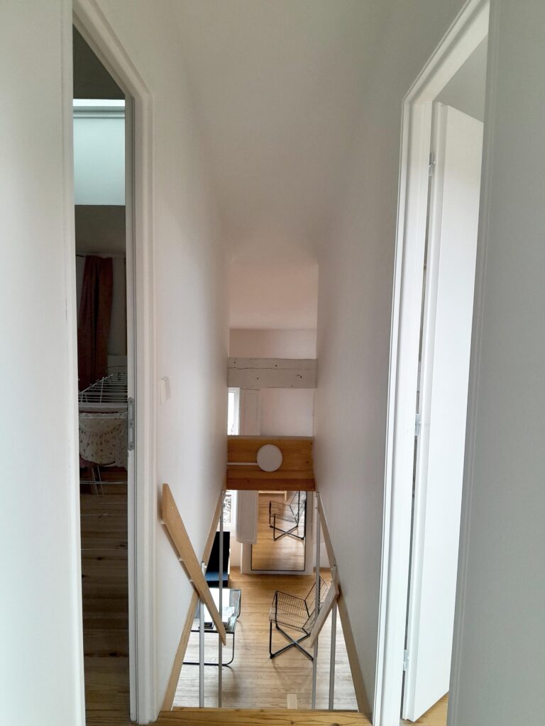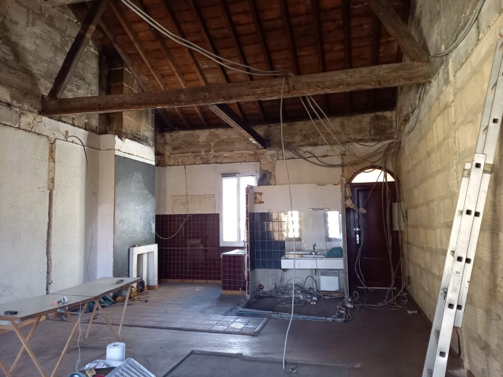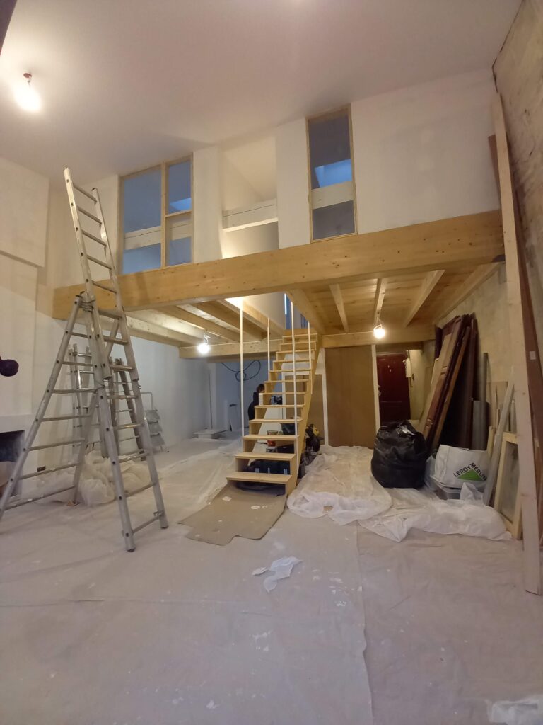 Bordeaux, rue Barreyre. Rénovation complète d’un appartement au sein d’une copropriété dans l’hypercentre bordelais : création d’un plancher en bois, d’une terrasse extérieure (tropézienne), modification des ouvertures, isolation des murs et plafonds. Projet livré en 2023